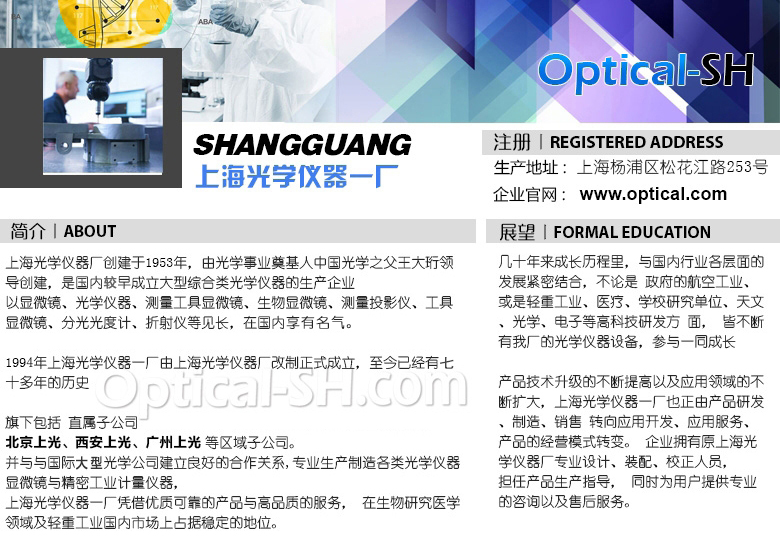 上海光學儀器一廠坐落在上海楊浦區,原上海光學儀器廠,現屬上海光學儀器研究所管轄生產型制造公司。上海光學儀器研究所擔負光學儀器新產品研制和開發,曾為上海光學儀器廠研制開發出各類光學儀器產品,填補了我國多項光學儀器的空白,現通過多次改制在原產品的基礎上不斷開發出各類更好的光學儀器,我們相信我們的產品將能給您帶來更多的方便,為您在工作中排憂解難。